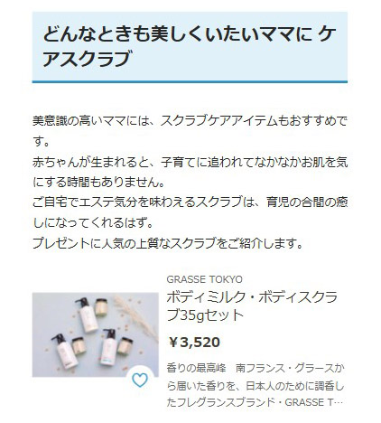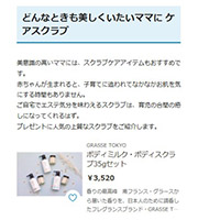 《妊婦さんが喜ぶやさしいプレゼント。妊娠祝いにぴったり、お役立ちマタニティギフト》 掲載商品「ボディミルク」「ボディスクラブ」 >>掲載記事はコチラ |